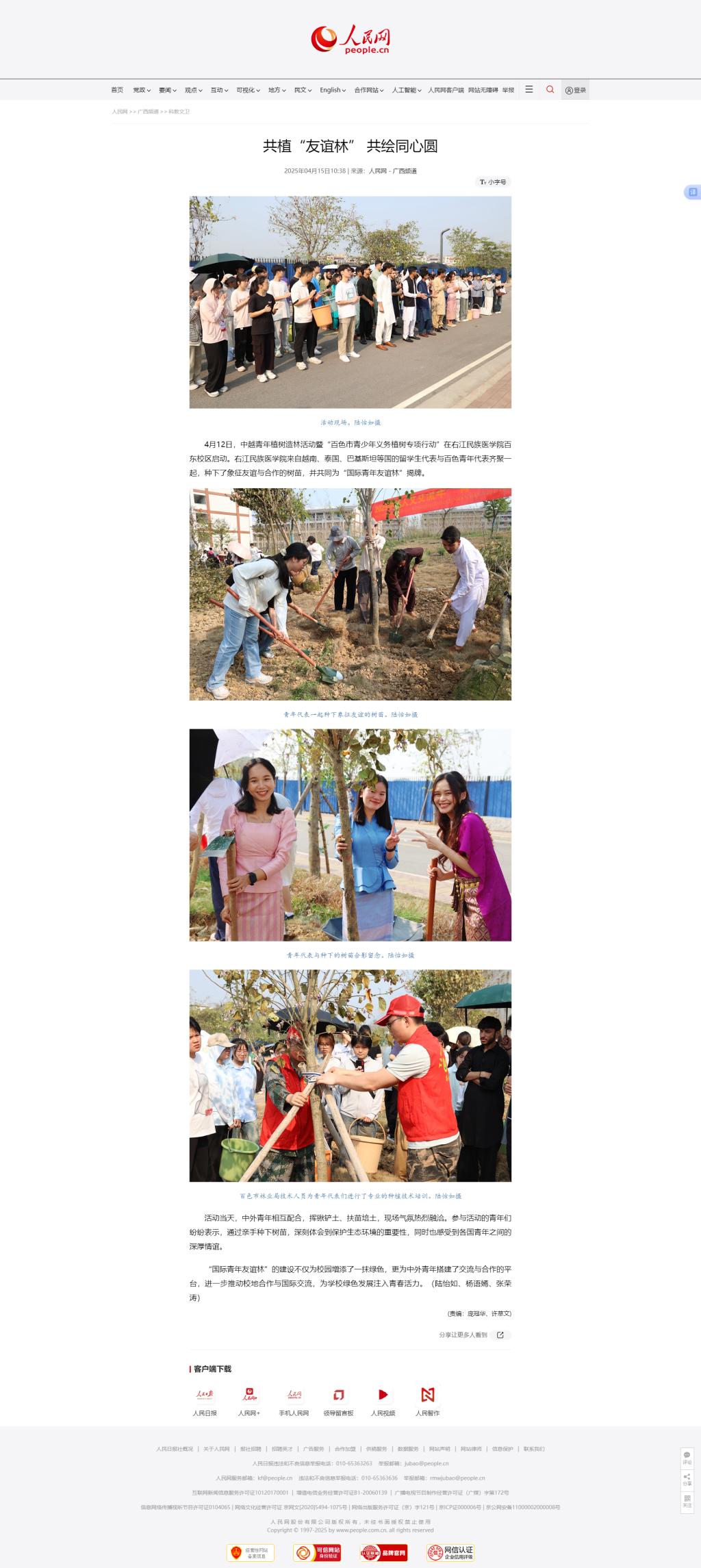 4月15日,人民网以《共植“友谊林” 共绘同心圆》为题,报道中越青年植树造林活动暨“百色市青少年义务植树专项行动”在开云官网启动。http://gx.people.com.cn/n2/2025/0415/c179462-41196906.html
