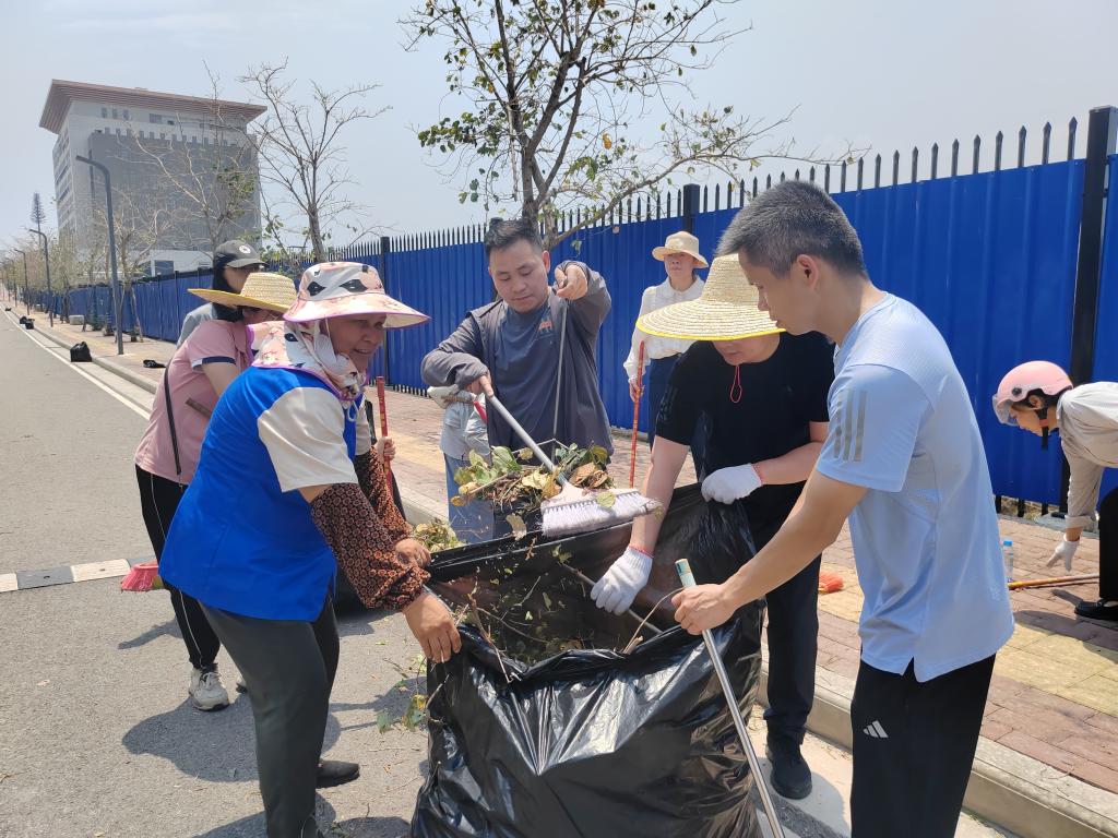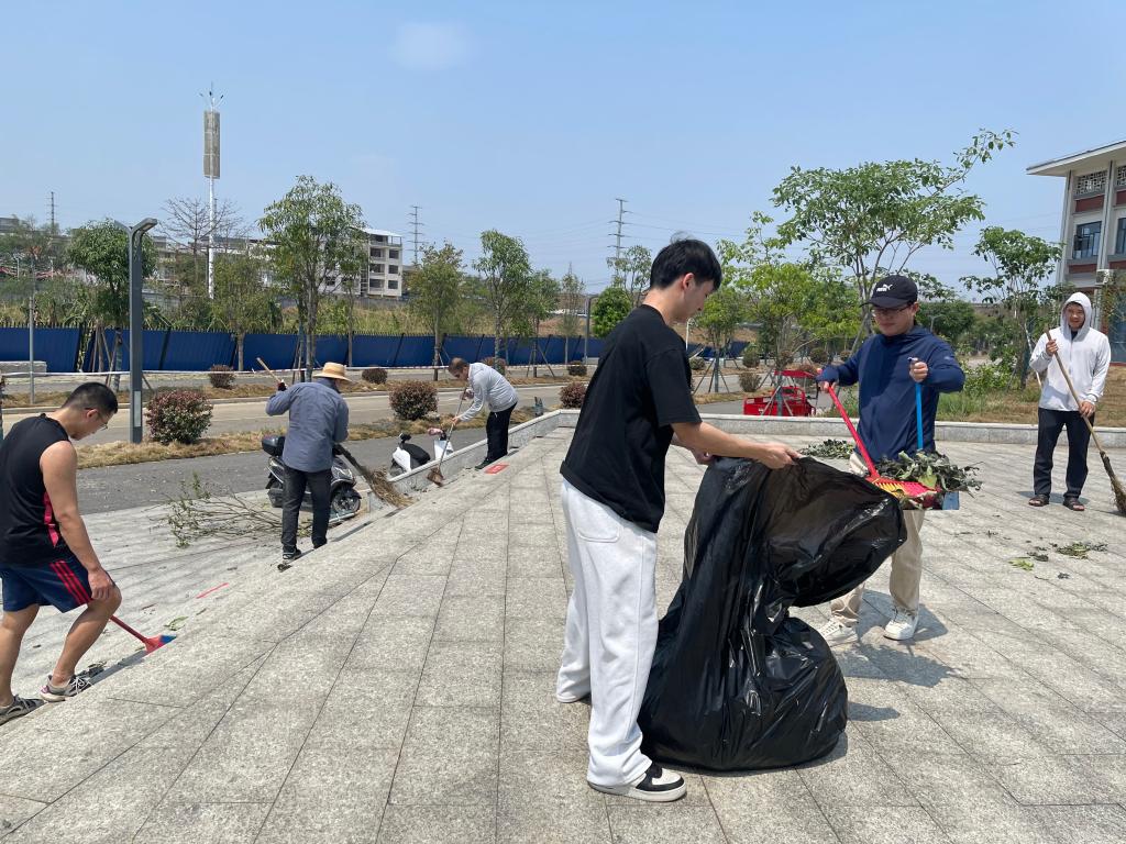 在校园的各大道路上,一位位师生党员手持扫把和垃圾铲,认真清理地上的枯枝落叶以及被大风带来的各种杂物,仔细装入垃圾袋中,他们分工明确、配合默契,展现出强大的凝聚力和战斗力,现场气氛热烈,呈现一片热火朝天的劳动场面。