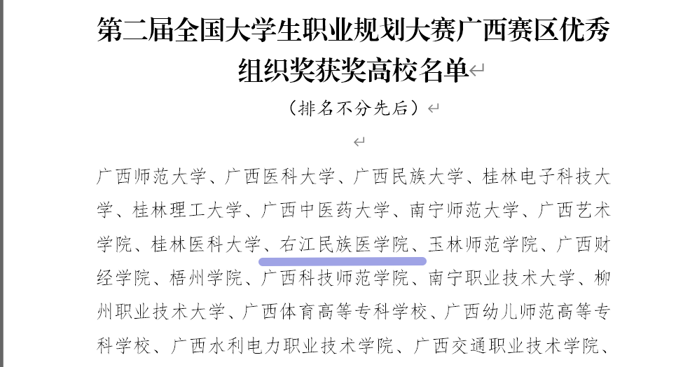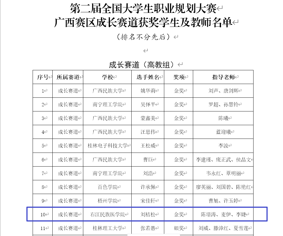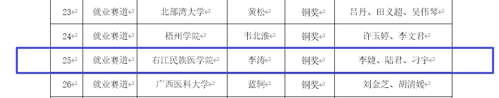 根据《自治区教育厅关于公布第二届全国大学生职业规划大赛广西赛区获奖名单的通知》(教学生〔2025〕5号),开云官网在第二届全国大学生职业规划大赛广西赛区比赛中,学校荣获广西赛区“优秀组织奖”集体奖。其中,共计5名学生荣获奖项:2024级护理学本科班刘桔松同学荣获高教组成长赛道金奖;2021级临床医学本科10班李涛同学荣获高教组就业赛道铜奖;2023级医学技术硕士研究生班宋延伦同学荣获高教研究生组就业赛道铜奖;2022级口腔医学本科阮诗婷、2023级临床医学本科11班李林莉同学荣获高教组成长赛道优秀奖。陈璟涛、麦伊、李婕3位老师荣获广西区赛“优秀指导老师”称号。实现学校在此项赛事的突破!