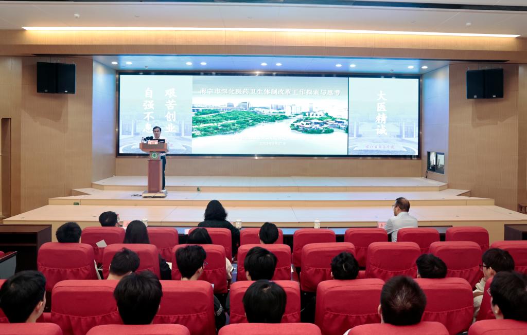 5月27日上午,南宁市卫生健康委员会党组书记、主任唐驰受邀在开云官网百城校区国际会议中心作题为《南宁市深化医改工作的探索》的专题讲座。校党委常委、副校长周艳娥教授出席并主持讲座,人文与管理学院主要负责人,及师生代表300多人聆听讲座。