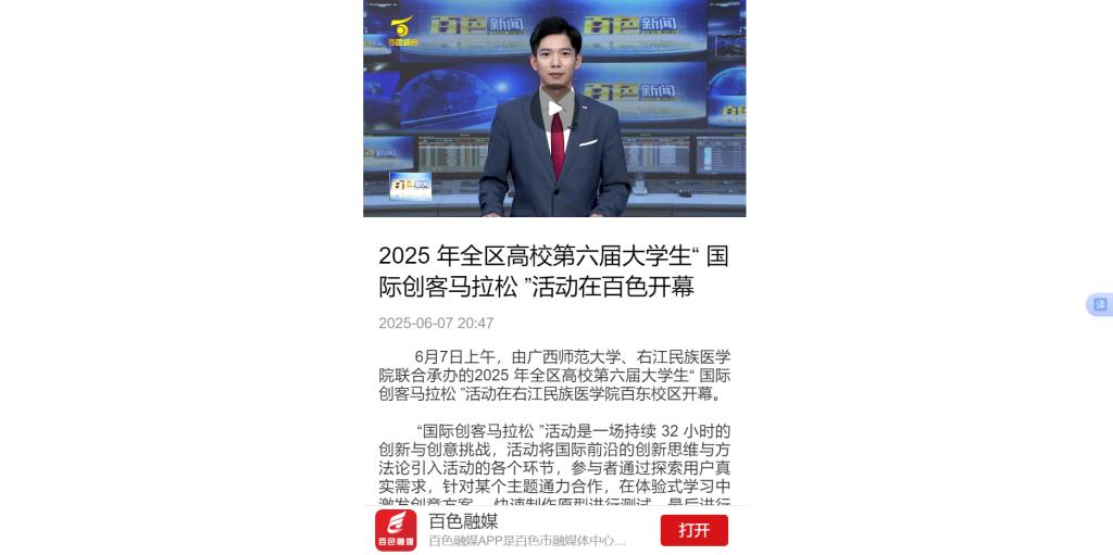 6月7日,百色融媒以《2025年全区高校第六届大学生“国际创客马拉松”活动在百色开幕》为题,报道由广西师范大学、开云kaiyun登录入口联合承办的2025年全区高校第六届大学生“国际创客马拉松”活动在开云kaiyun登录入口百东校区开幕。