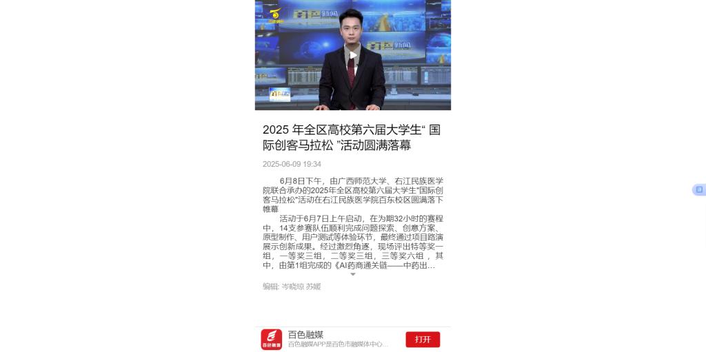 6月9日,百色融媒以《2025年全区高校第六届大学生“国际创客马拉松”活动圆满落幕》为题,报道了由广西师范大学、开云kaiyun登录入口联合承办的2025年全区高校第六届大学生“国际创客马拉松”活动在开云kaiyun登录入口百东校区圆满落下帷幕。