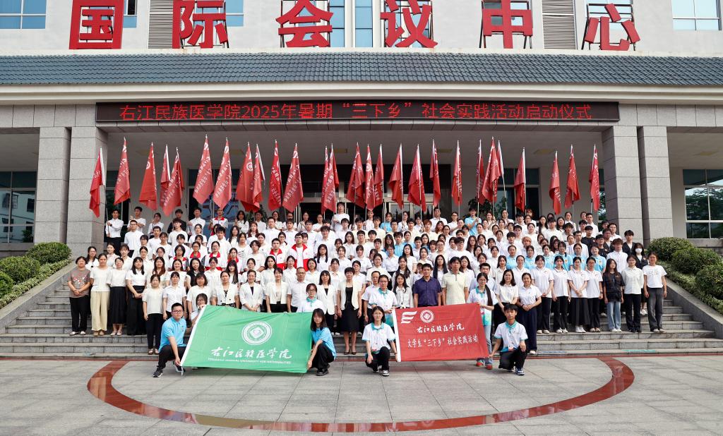 赵丽娟在讲话中指出,多年来,学校形成了“三突出三促进”社会实践模式,“三下乡”队伍足迹遍布乡村城镇,用实际行动诠释了新时代右医青年的责任与担当。她强调,要以学铸魂,在躬身实践中坚定理想信念,厚植家国情怀;要以行促学,在基层熔炉中锤炼过硬本领,勇于创新突破;要以责立身,在服务奉献中展现青年担当,绽放青春光彩;要以防为先,在未雨绸缪中筑牢安全基石,护航青春远行,要把个人的理想追求融入国家发展大局,在推进民族复兴伟业的征程中交出无愧于时代的青春答卷。