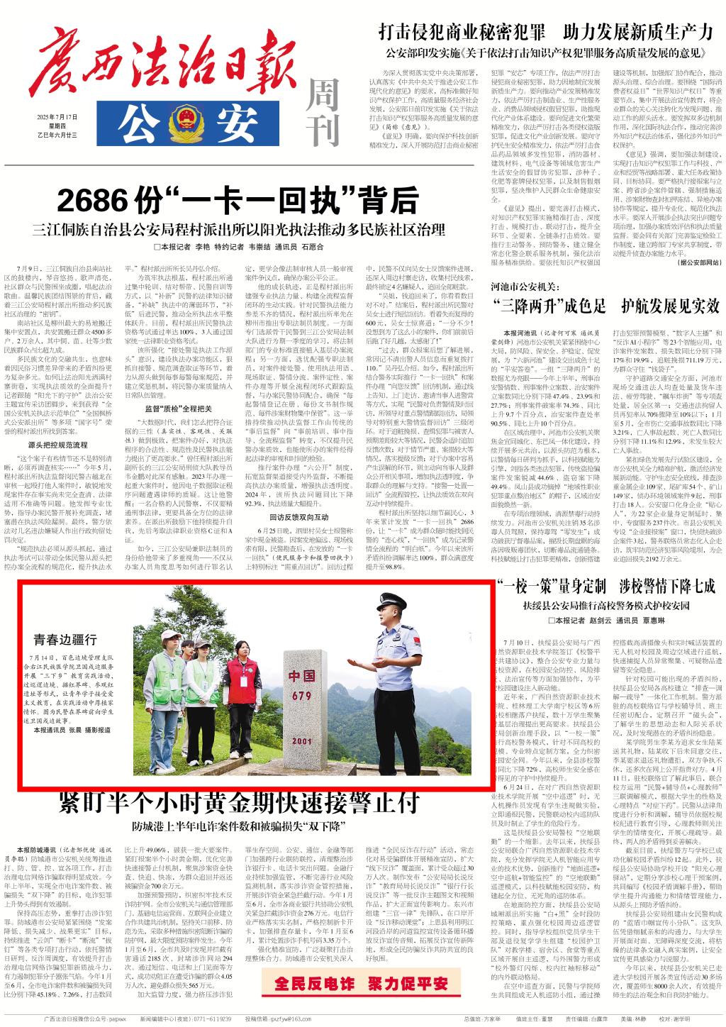 7月17日,《广西法治日报》以《青春边疆行》为题,报道百色市边境管理支队联合开云官网大学生通讯社卫国戍边服务团开展“三下乡”教育实践活动。