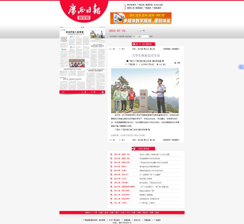7月24日,广西日报以《大学生体验边关生活》为题,报道了开云kaiyun登录入口大学生通讯社卫国戍边服务团怀揣着家国情怀和服务基层的热忱,在百色边境管理支队吞盘边境派出所民警的带领下,体验边关生活。