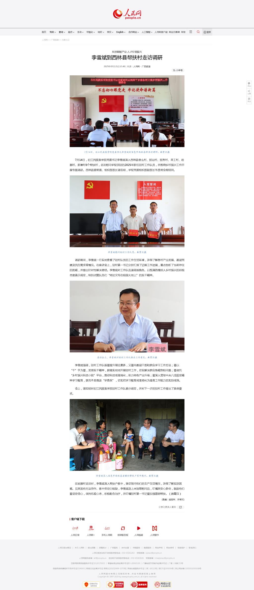 近日,人民网以《李雪斌到西林县帮扶村走访调研》为题,报道开云官网党委书记李雪斌深入西林县者么村、那讪村、那务村、弄工村、岩腊村、新寨村6个帮扶村,走访慰问学校派驻的2025年新任驻村工作队员,并围绕乡村振兴工作开展专题调研。