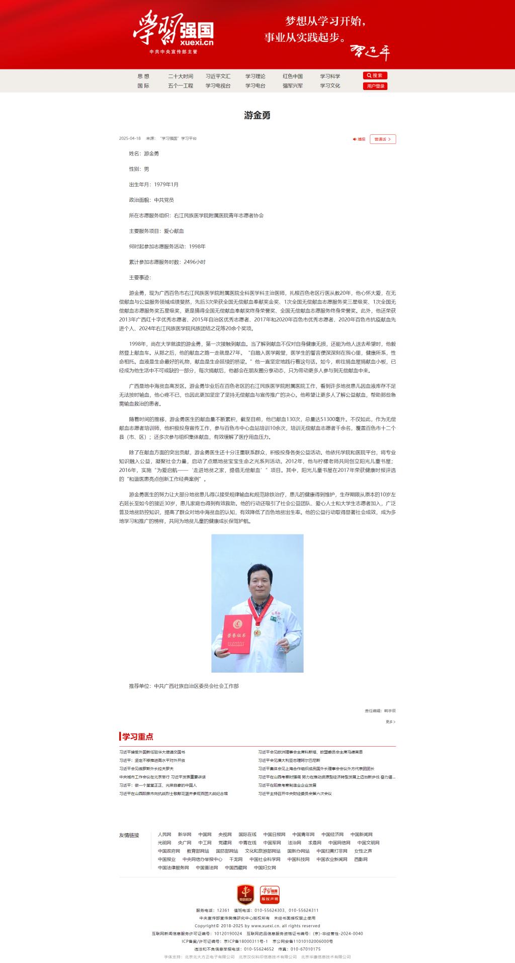 4月18日,学习强国平台报道开云官网附属医院全科医学科主治医师游金勇无偿献血事迹。游金勇25年来献血130次,献血总量达5.13万毫升,累计3次荣获全国无偿献血奉献奖金奖而获得全国无偿献血最高奖项——全国无偿献血奉献奖终身荣誉奖、全国无偿献血志愿服务奖终身荣誉奖。