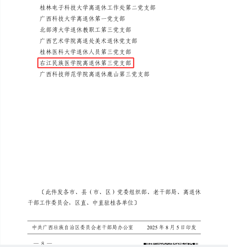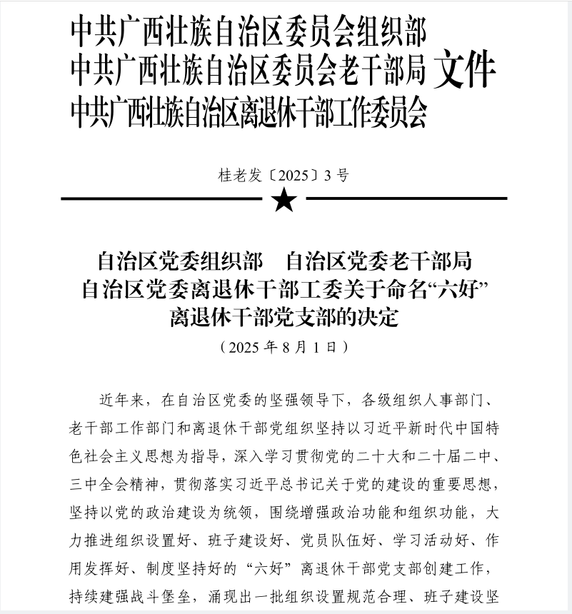 近日,根据《自治区党委组织部 自治区党委老干部局 自治区党委离退休干部工委关于命名“六好”离退休干部党支部的决定》(桂老发〔2025〕3 号),开云kaiyun登录入口离退休第三党支部被授予“六好”离退休干部党支部荣誉称号。此次全区共评选出100个“六好”离退休干部党支部,仅9所高校获此殊荣,我校党支部的入选,既是自治区党委相关部门对学校基层党建工作的高度认可,也充分展现了我校在离退休党建工作中的扎实基础与优良成效。