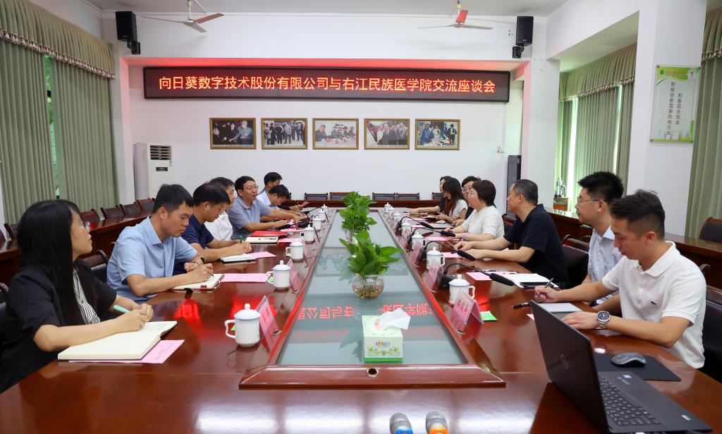 向日葵数字技术股份有限公司、广西北投信创科技投资集团有限公司、广西云坤科技产业有限公司相关负责人,学校院办、教务处、发规处、信技中心、医学技术与人工智能学院等部门负责人参加座谈会。
