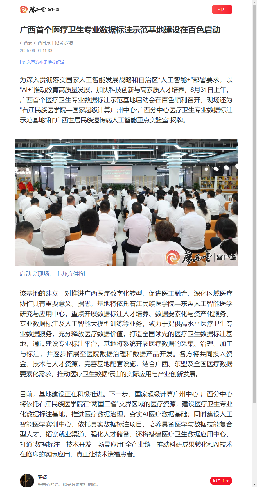 近日,广西云以《广西首个医疗卫生专业数据标注示范基地建设在百色启动》为题,报道了广西首个医疗卫生专业数据标注示范基地启动会在开云官网百东校区召开。现场还进行了“开云kaiyun登录入口—国家超级计算广州中心·广西分中心医疗卫生专业数据标注示范基地”和“广西世居民族遗传病人工智能重点实验室”揭牌仪式。