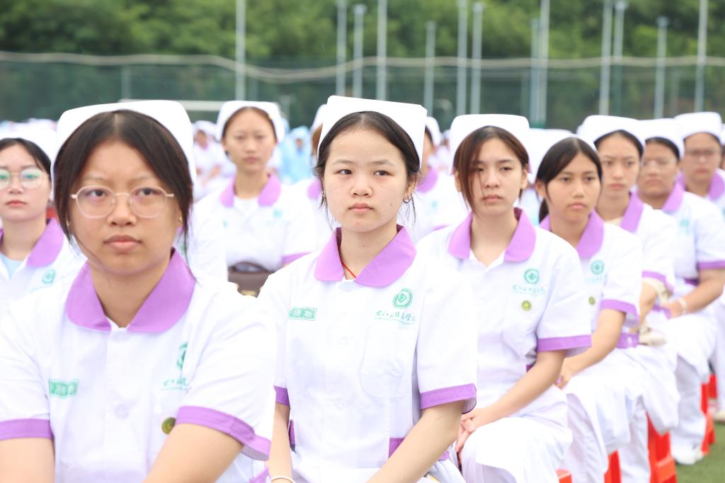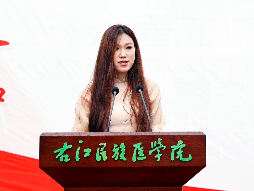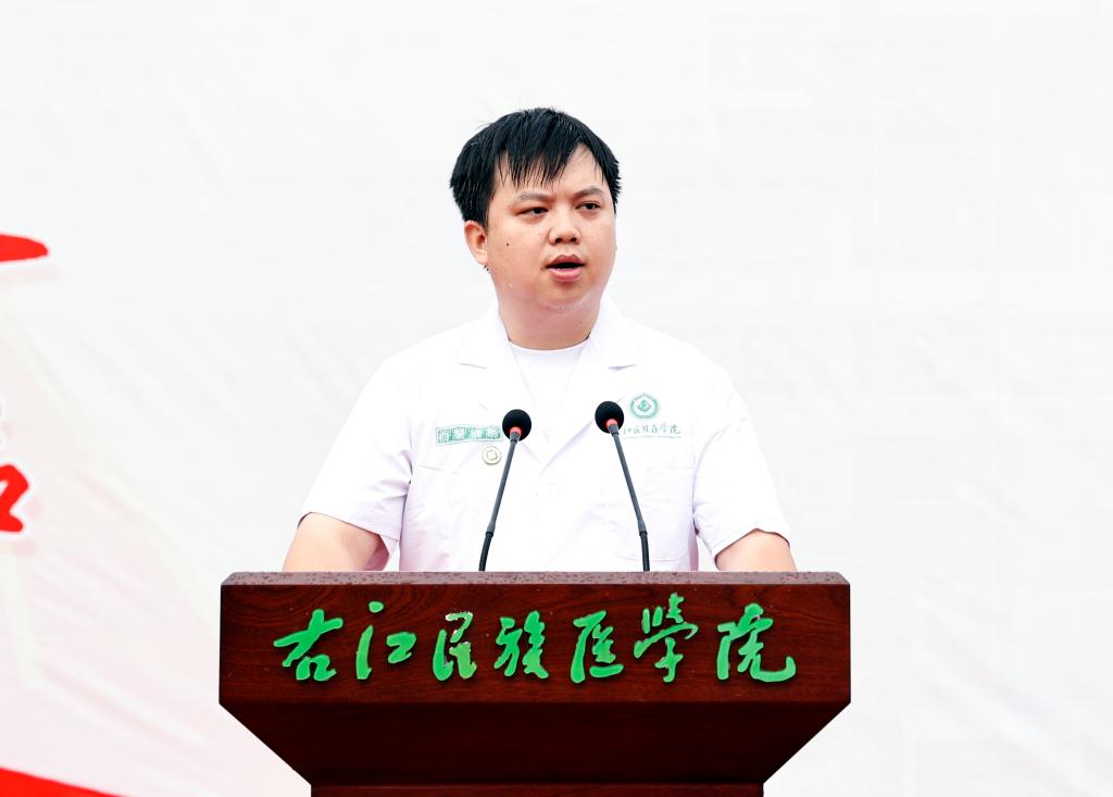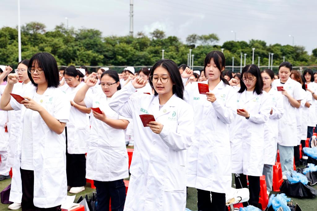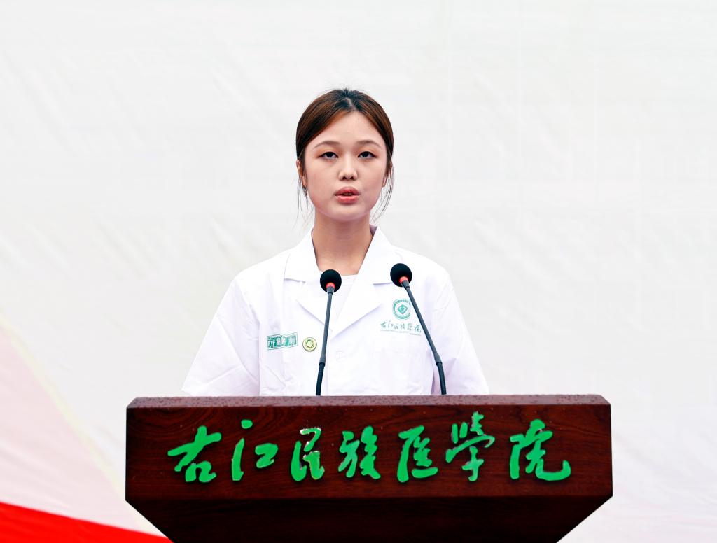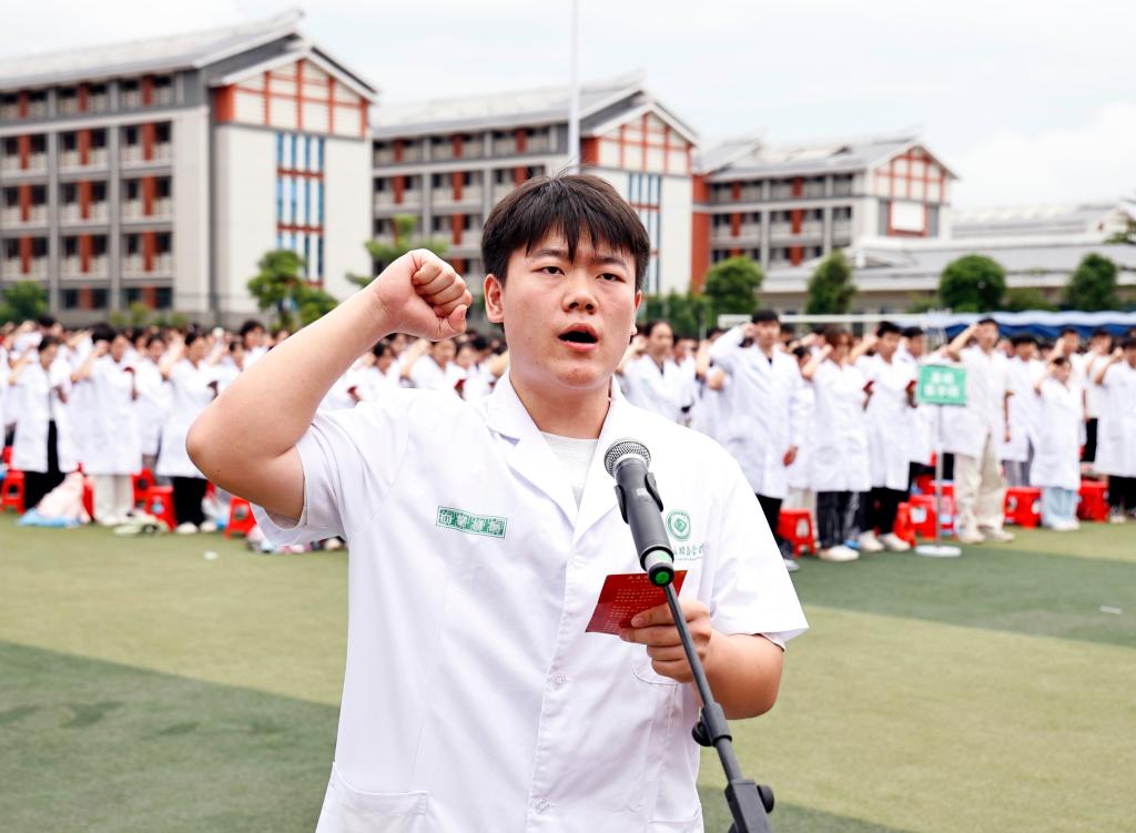 典礼上,24临本3班孙浩然带领新生进行医学生誓词宣誓,铿锵誓言响彻操场,展现了新时代右医人“健康所系、性命相托”的使命与担当。