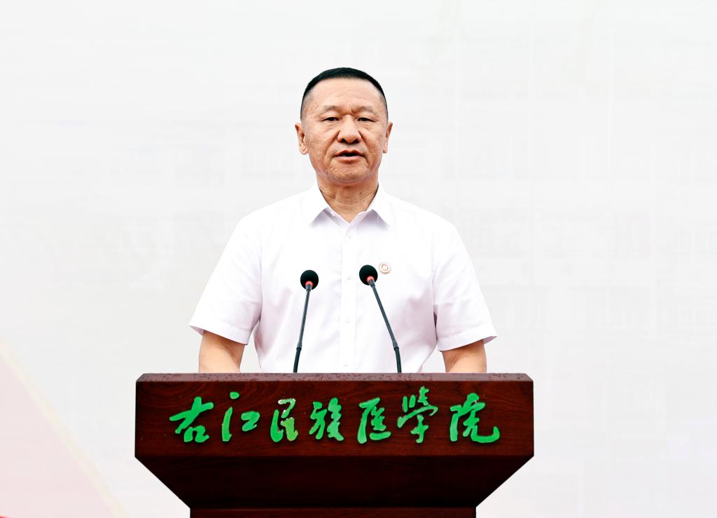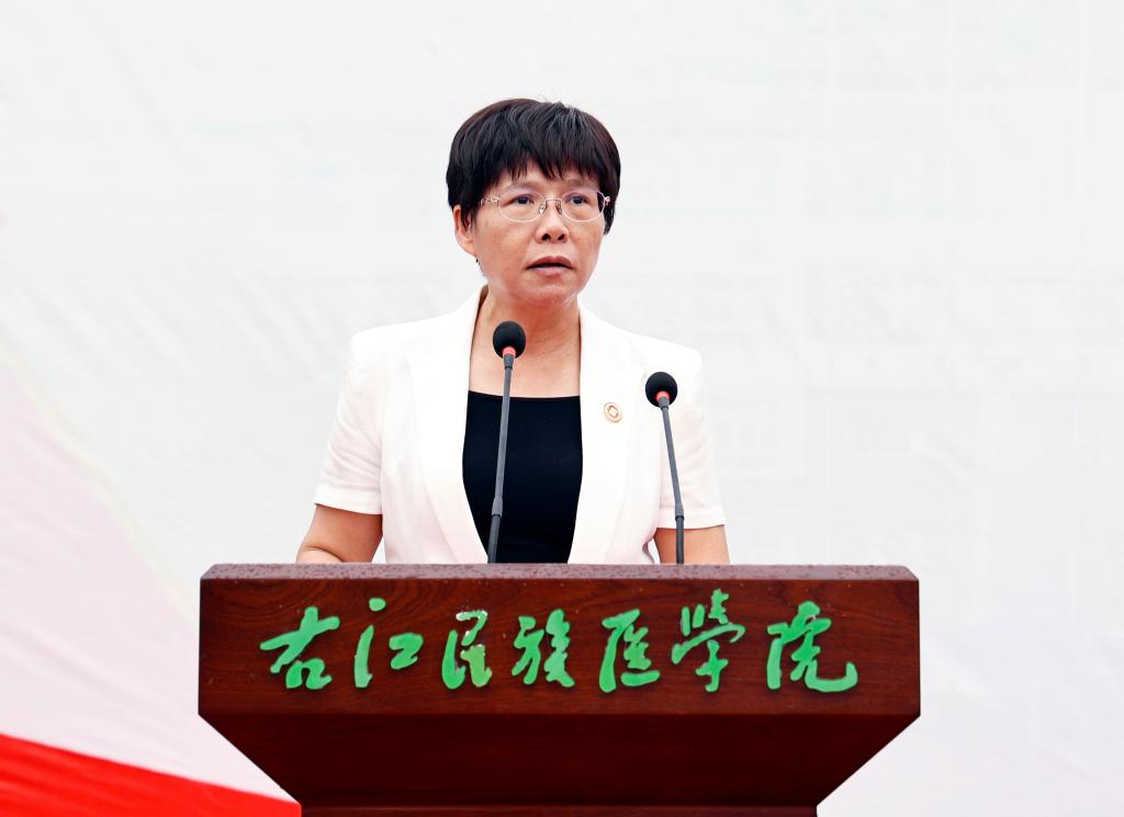 在庄严的国歌声中,五星红旗冉冉升起,开学典礼正式拉开帷幕。校领导为新生代表佩戴校徽,一枚枚校徽既承载着“艰苦创业、自强不息”的右医精神,也寄托着学校对每一位新同学的殷切期望。