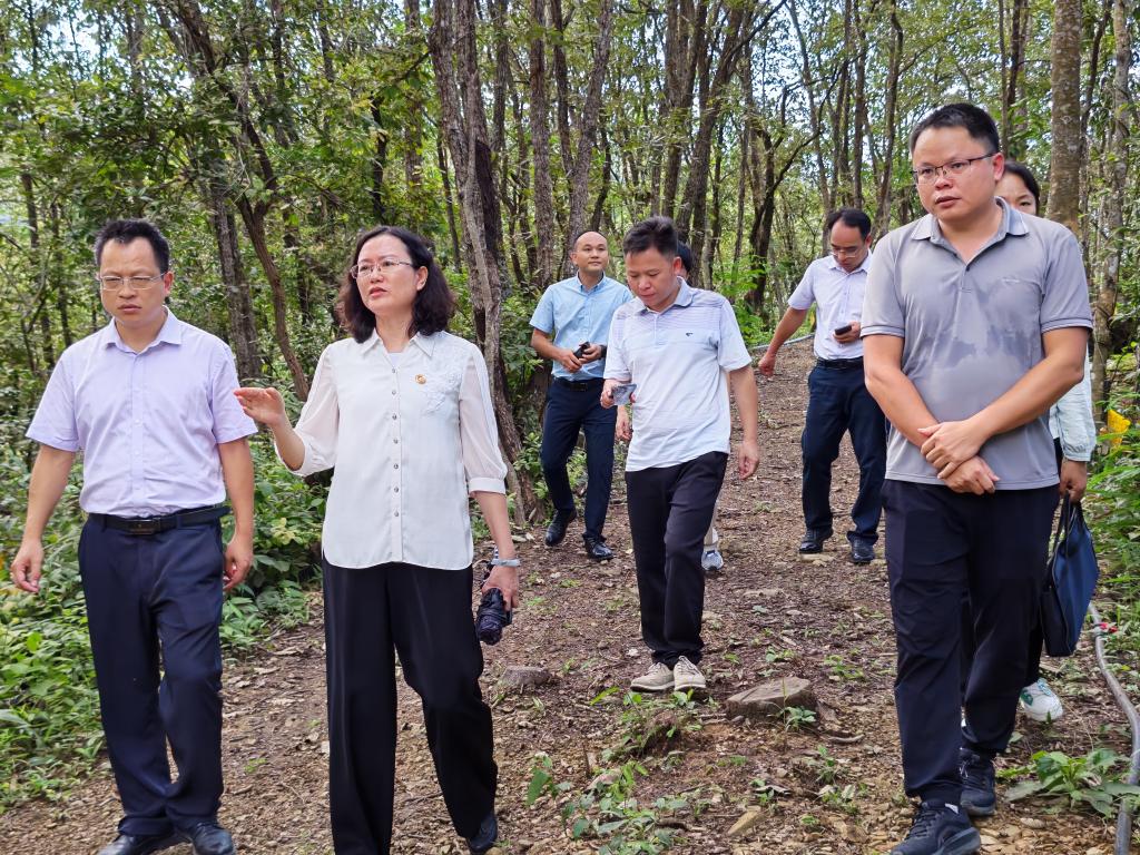 考察团一行来到田林县旧州镇那度村林下灵芝种植示范基地。周艳娥与基地负责人及当地干部亲切交流,详细询问灵芝的菌种选育、种植技术、采收加工、市场价格及收益等情况。