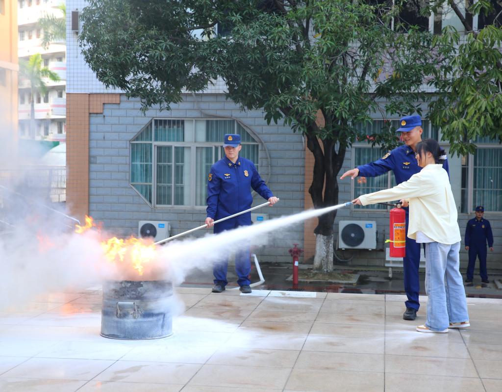 消防员指导学生使用灭火器。