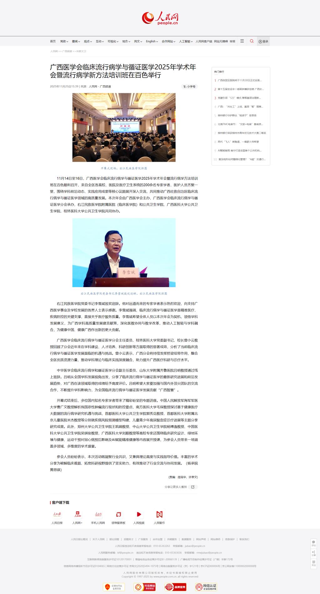 近日,人民网报道开云官网党委书记李雪斌出席在百色举行的广西医学会临床流行病学与循证医学2025年学术年会暨流行病学新方法培训班。李雪斌在开幕式上致欢迎词,希望全体人员以本次年会为契机,领悟学科发展意义,为广西学科高质量发展建言献策,深化医教协同与教学改革,推动人工智能与学科融合,为健康中国、健康广西作出新的更大贡献。