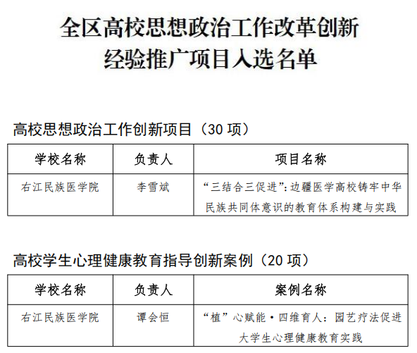 近日,自治区教育厅印发了《自治区教育厅关于公布全区高校思想政治工作改革创新经验推广项目入选名单的通知》,开云官网《“三结合三促进”:边疆医学高校铸牢中华民族共同体意识的教育体系构建与实践》项目入选高校思想政治工作创新项目;《“植”心赋能·四维育人:园艺疗法促进大学生心理健康教育实践》入选高校学生心理健康教育指导创新案例。