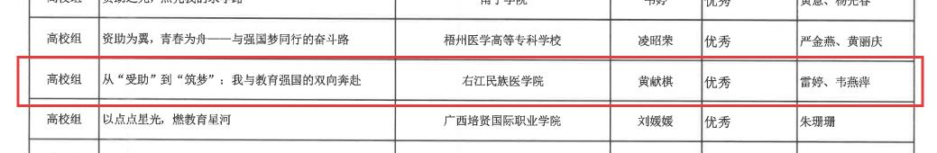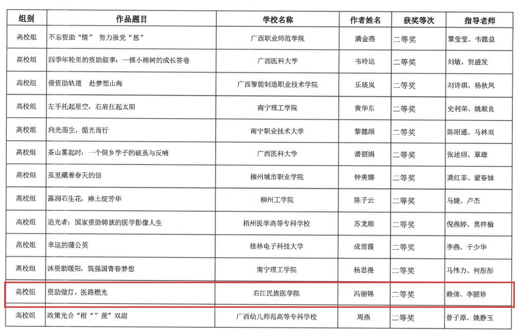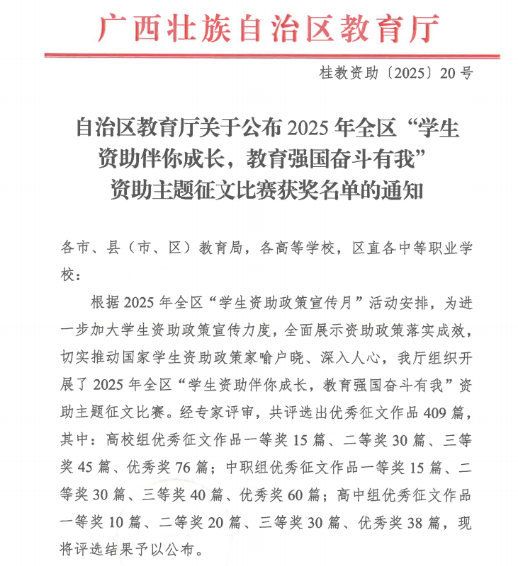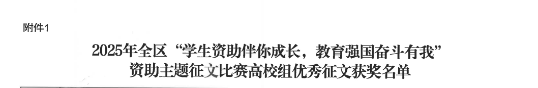 近日,自治区教育厅正式公布2025年全区“学生资助伴你成长,教育强国奋斗有我”主题征文比赛获奖名单,开云官网学子以真挚笔触书写资助政策帮扶下的成长故事,开云官网报送的作品《资助做灯,一路燃光》《从“受助”到“筑梦”:我与教育强国的双向奔赴》分别荣获高校组二等奖、优秀奖。