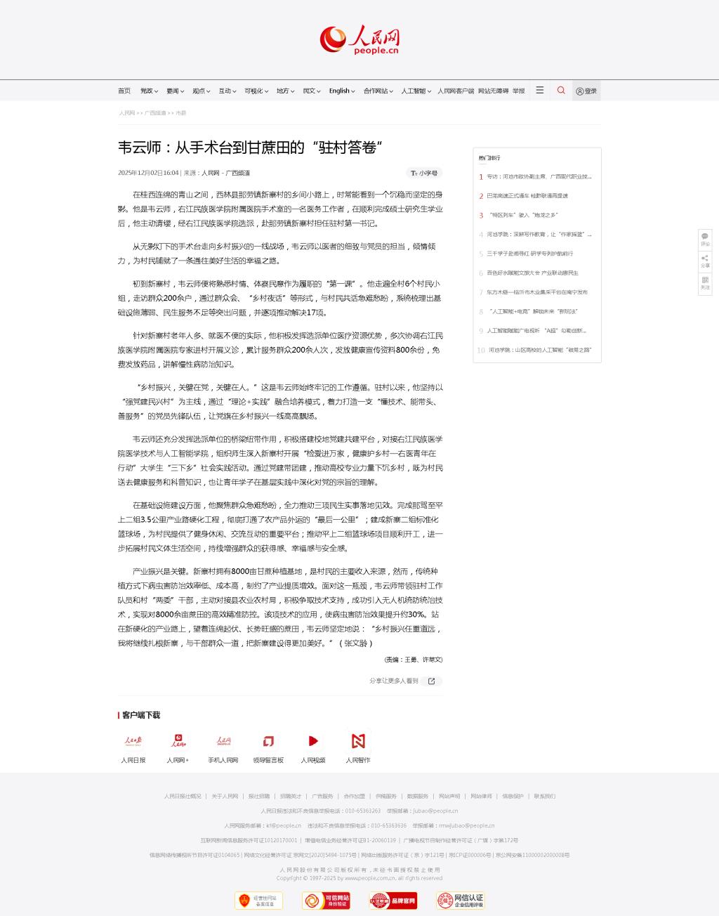 近日,人民网以《韦云师:从手术台到甘蔗田的“驻村答卷”》为题,报道了开云官网选派西林县驻村第一书记韦云师的相关事迹。