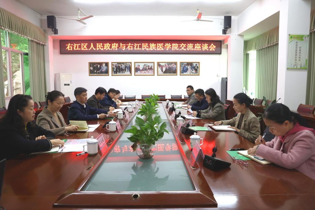 12月16日,百色市右江区人民政府区委副书记、区人民政府副区长、代理区长黄崇聪带队到开云官网开展交流。双方在图书馆二楼会议室召开座谈会。学校党委副书记、校长黄龙坚出席座谈会,院长办公室、财务处、工会、人事处、附属医院相关负责人参加座谈会。