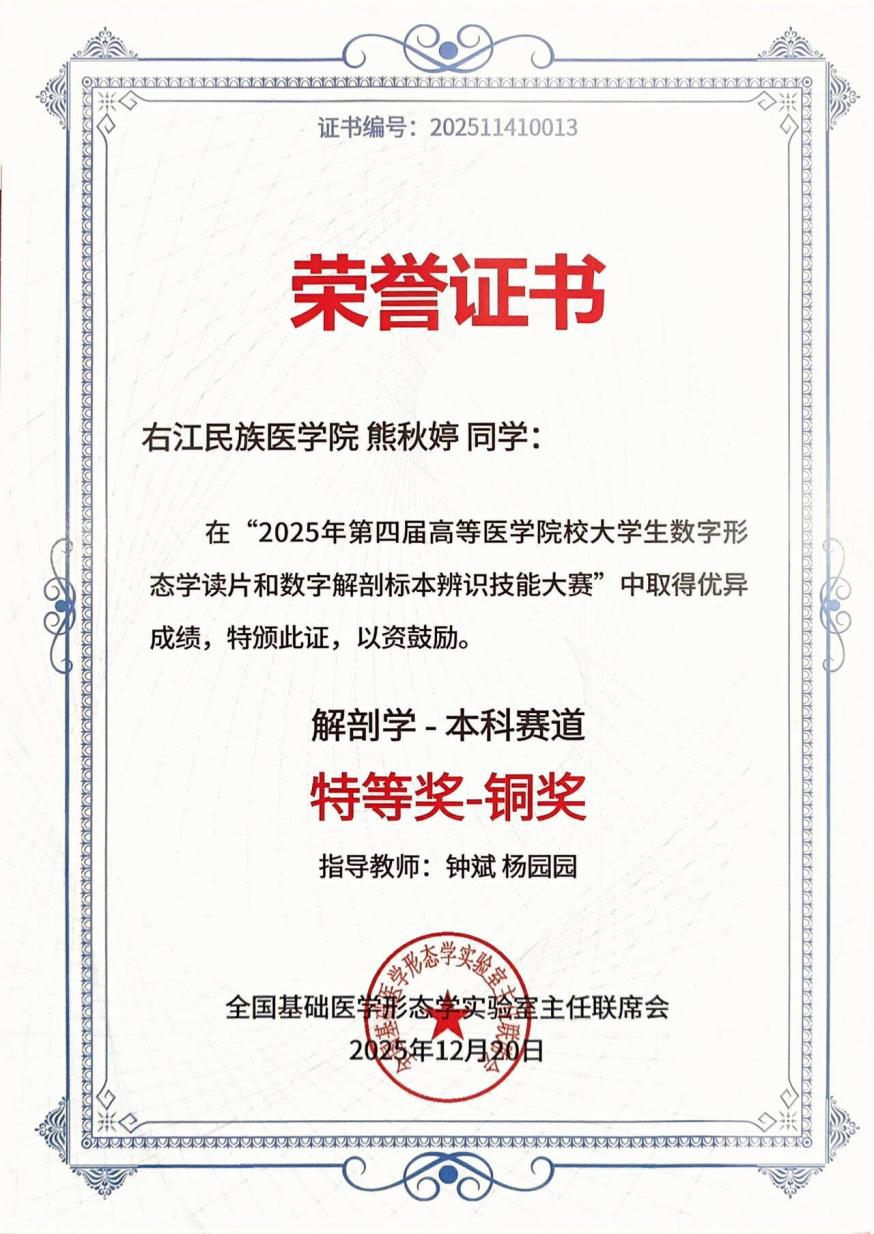 近日,由全国基础医学形态学实验室主任联席会与山东数字人科技股份有限公司联合主办的“第四届高等医学院校大学生数字形态学读片和数字解剖标本辨识技能大赛”圆满落幕。开云官网2022级临床医学专业熊秋婷在12月20日于山东济南举行的现场总决赛中荣获特等奖之铜奖。