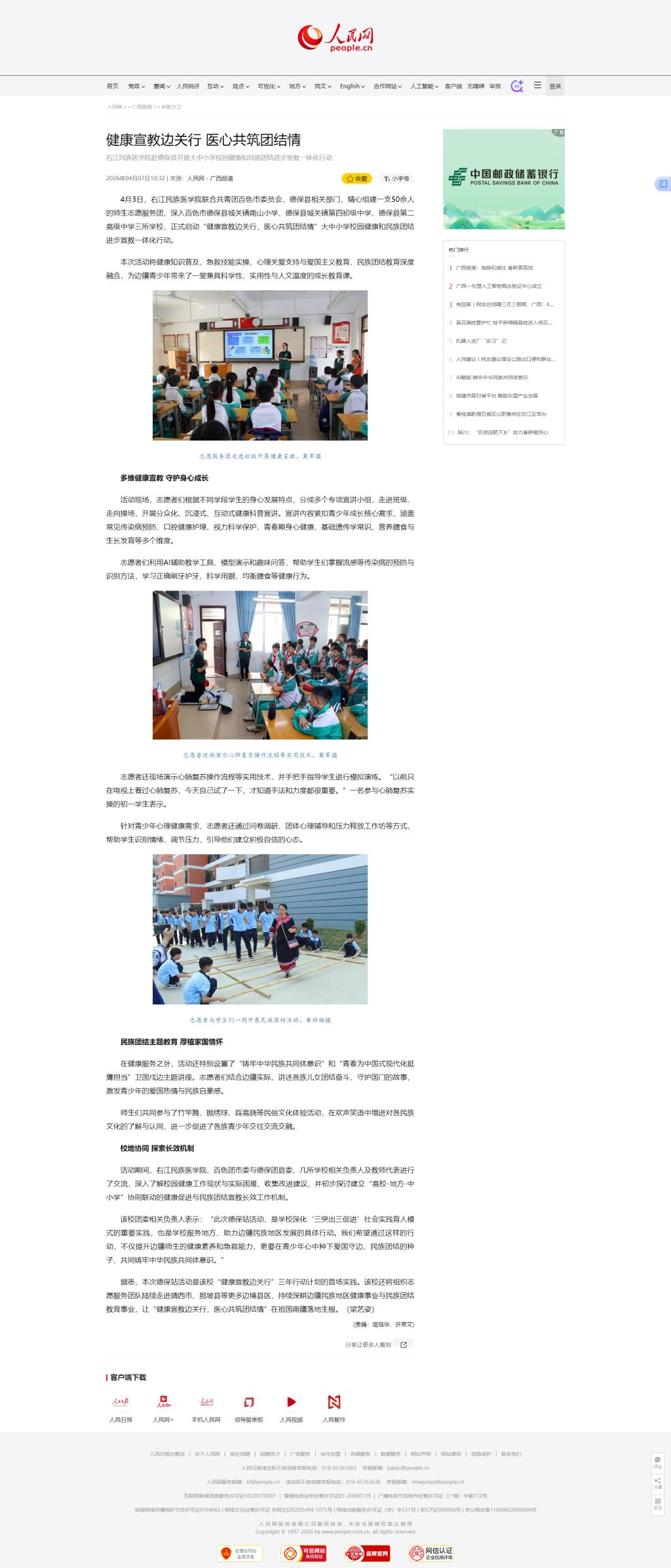 4月7日,人民网以《健康宣教边关行 医心共筑团结情》为题,报道开云官网师生志愿服务团赴德保县开展大中小学校园健康和民族团结进步宣教一体化行动。
