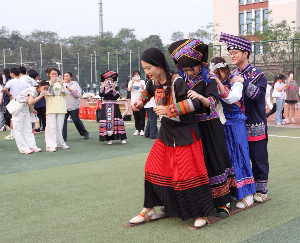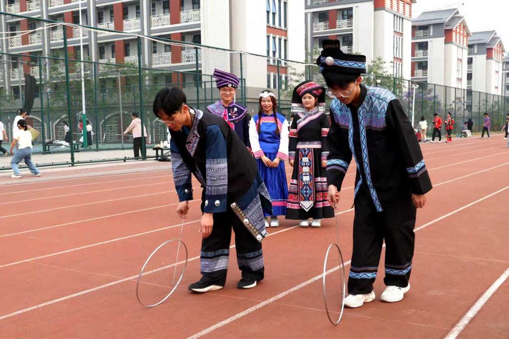 竹竿舞场地上,清脆的竹竿敲击声与欢快的脚步声、笑声交织在一起,各族师生携手跳跃、默契配合,轻快灵动的身影成为校园里一道亮丽风景。不少同学边跳边交流技巧,笑声不断,大家在互动竞技中增进情谊、深化协作,让“各民族像石榴籽一样紧紧相拥”的理念在欢声笑语中落地生根。