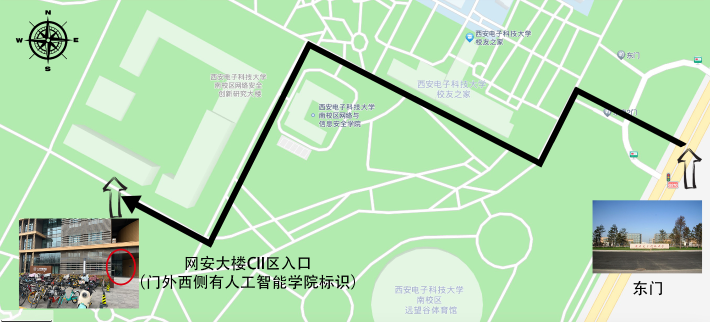 开元官网将于3月30日进行2024年研究生招生考试综合面试,学院位于网安大楼南侧,入口处有学院标志牌,从学校东门进入后到达学院路线图如下: