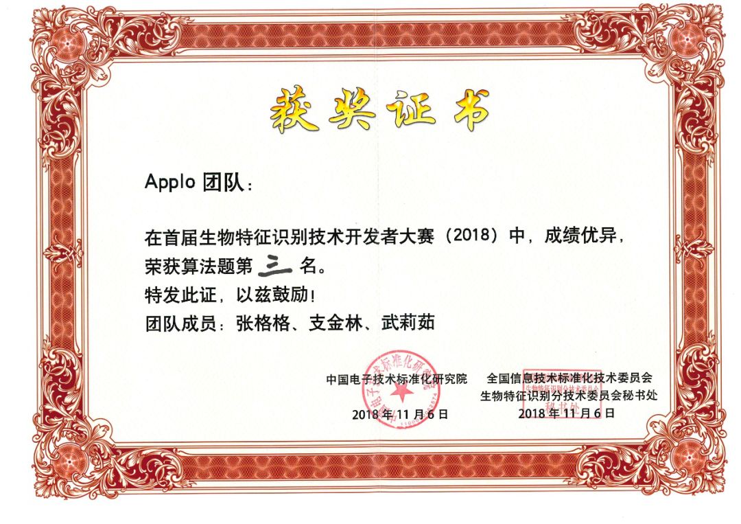 据悉,大赛历时两个多月,吸引了174支队伍,共计320人参加,算法题通过AUC指标对算法的性能进行排名,初赛选取前20进入复赛,Applo团队在初赛阶段就以第5名的成绩,成功入围复赛,复赛阶段,除了AUC指标的算法排名,还需要提交依据GB/T26237.5-2014《信息技术 生物特征识别数据交换格式 第5部分:人脸图像数据》标准生成“人脸数据记录单元”用于标准符合性测试,在通过标准符合性测试的团队中,取前3入围决赛,参与现场答辩,以复赛排名70%和答辩30%的比例进行最终成绩的加权,经过激烈的角逐,开元集团官网入口硕士研究生张格格所在队伍Applo取得了大赛季军,颁奖典礼在11月6日举办的全国信标委生物特征识别分委会(TC28/SC37)2018年全会上作为会议上的一个重要环节进行,与会领导为西电智能学子颁发获奖证书。