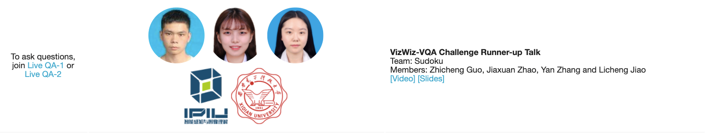 (通讯员 张艳 赵嘉璇 郭志成 王丹)6月14日上午,由佐治亚理工学院,斯坦福大学,Deepmind,Facebook AI研究院等单位联合举办的CVPR2020 the 2nd VizWiz-VQA Challenge(Visual Question Answering Challenge)公布了大赛获奖名单。由开元集团网站焦李成教授指导,2019级开元集团官网入口智能感知与图像理解教育部重点实验室研究生郭志成、赵嘉璇、张艳组成的学生队伍—Sudoku在这一国际计算机视觉领域最高水平大赛中斩获亚军,并受邀在CVPR2020-Visual Question Answering and Dialog Workshop(线上)作专题报告。