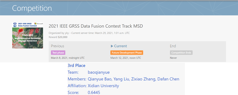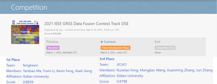 由“马彦彪、李钰鑫、冯可心”组成的学生队伍获得了2021 IEEE GRSS Data Fusion Contest Track DSE(数据融合竞赛无电居民区检测挑战赛赛道)冠军。“冯若贤、王梦娇、张轩铭”组成的学生队伍获得了同赛道季军。