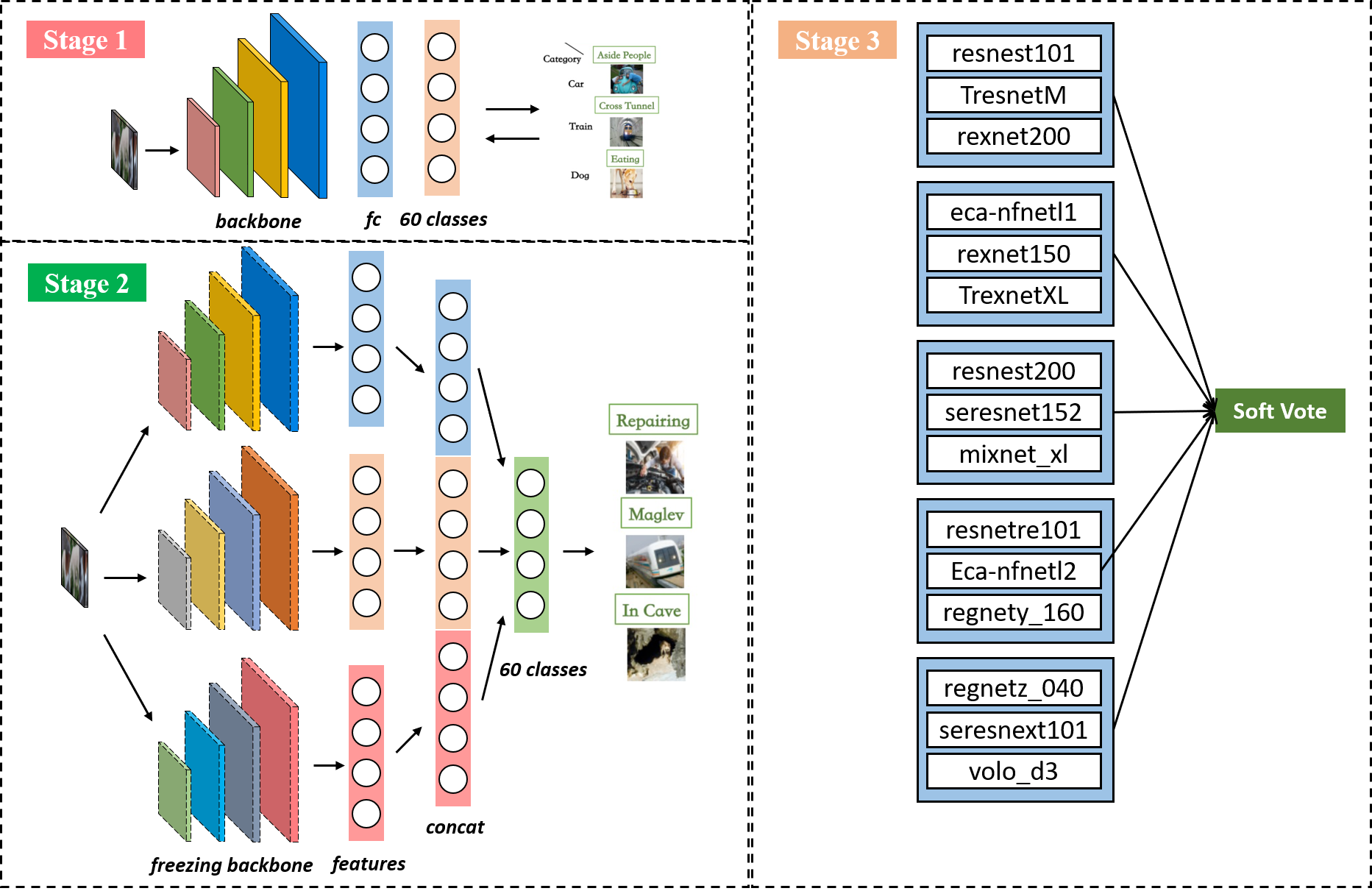 季军方案:NICO Challenge赛道2主要任务是通过促进对具有固有不变性和泛化能力的内在学习机制的研究,促进视觉识别中的面向对象泛化。季军队伍提出A Three-Stage Model Fusion Method for Out-of-Distribution Generalization (简称:TSMFM),使用三阶段融合的方法解决此问题。在第一阶段,训练不同结构的单模型作为初始模型。第二阶段,将初始单模型每三个分为一组,拼接全连接层并冻结其他参数重新训练fc层。第三阶段,对第二阶段的结果使用提出的自适应权重软投票融合算法进一步提升最后的准确率。