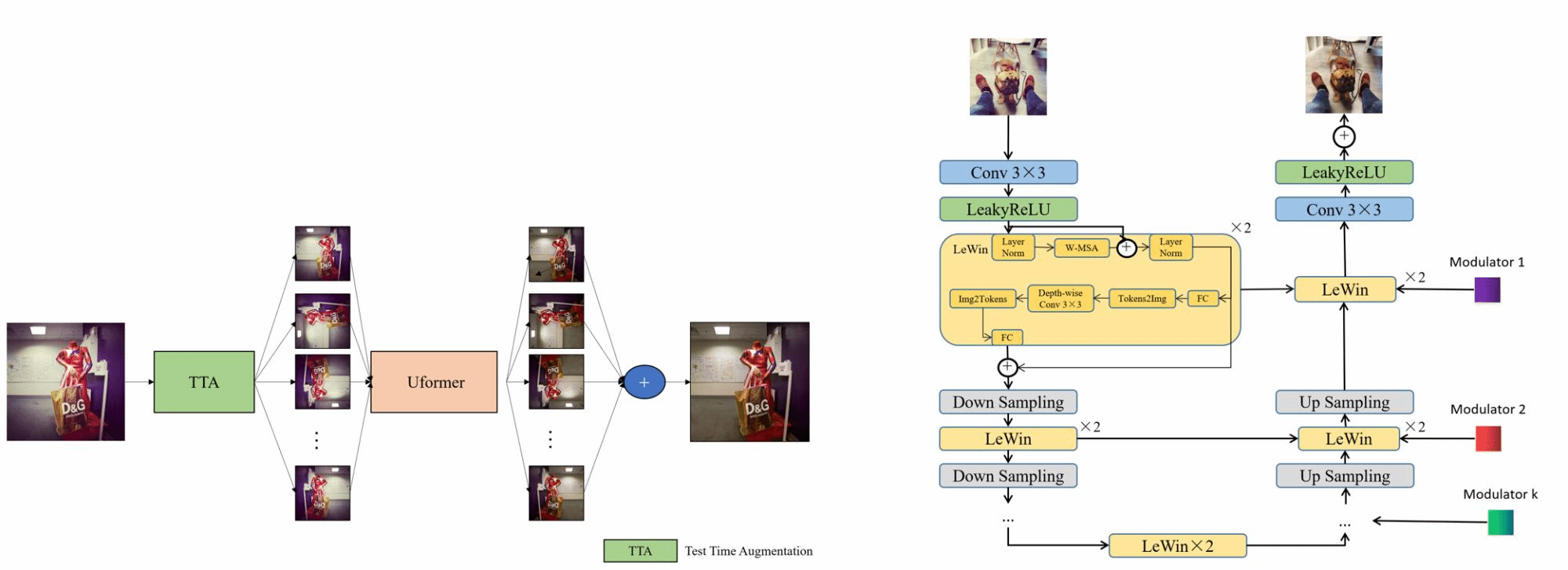 冠军方案:冠军队伍提出了UTFR方法来还原滤镜后的图像(A U-shaped transfomer for filter removal,简称:UTFR)。将滤镜看作一种另类的图像噪声,因此去除滤镜就相当于为图像去噪。在Uformer模型的基础上引入了TTA机制(Test Time Augmentation),在模型的训练时通过数据增强的方法来扩充数据量,增强模型的泛化性。最后在测试中分别对测试的图像进行相同的数据增强方法,并将变化后的图像进行融合,得到最终的结果。