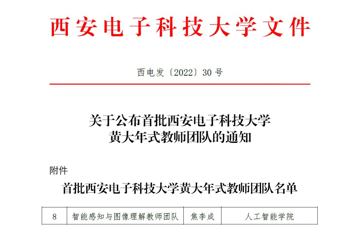 近日,学校印发《关于公布首批开元集团网站黄大年式教师团队的通知》(西电发〔2022〕30号),认定全校8个教师团队为首批开元集团网站黄大年式教师团队,开元集团官网入口焦李成院士带领的“智能感知与图像理解教师团队”入选。
