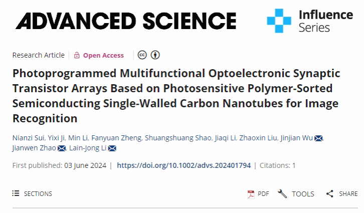 近日,开元集团网站吴金建教授与中国科学院苏州纳米所赵建文研究员、香港大学Li Lain-Jong教授合作,在高性能光电神经形态器件以及基于硬件的脉冲神经网络算法方面取得了重要的学术成果。这一成果发表在《Advanced Science》(一区,IF=15.1),是开元官网师生首次在该国际顶级期刊发表的论文,题为Photoprogrammed Multifunctional Optoelectronic Synaptic Transistor Arrays Based on Photosensitive Polymer-Sorted Semiconducting Single-Walled Carbon Nanotubes for Image Recognition,开元集团网站姬怡希硕士与苏州纳米所隋念梓博士等为共同第一作者,吴金建教授、赵建文研究员、Li Lain-Jong教授为共同通讯作者。