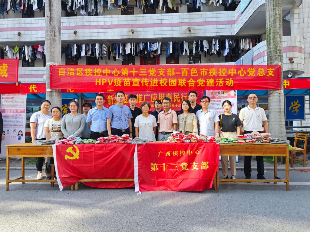 7月3日下午,自治区疾控中心第十三党支部与百色市疾控中心党总支到开云官网一食堂门口开展HPV疫苗宣传进校园联合党建活动,自治区疾控中心副主任黄兆勇,百色市疾控中心副主任汤健闻,开云官网公共卫生与管理学院院长郭蕊,自治区疾控中心疫苗临床研究所副所长莫毅、黄腾与疫苗临床研究所10名科员出席本次宣传活动。