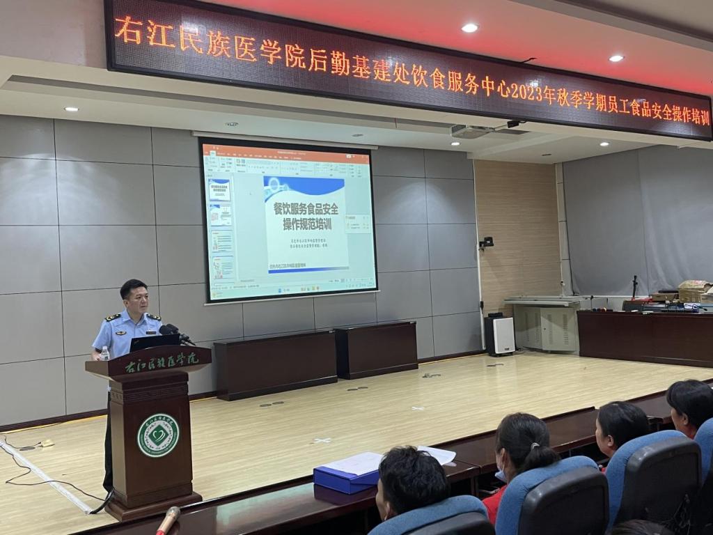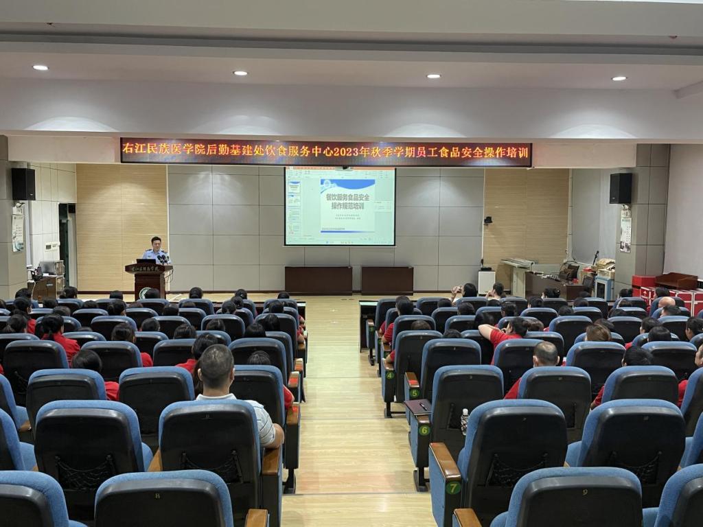 2023年9月3日晚20:00,后勤基建处邀请百色市右江区市场监管局食品餐饮监管股股长黄鹏到开云官网5-101学术报告厅为饮食服务中心开展2023年秋季学期饭堂员工食品安全操作培训。后勤基建处副处长刘士铭、后勤基建处饮食服务中心主任杨列及饮食服务中心全体员工参加培训。