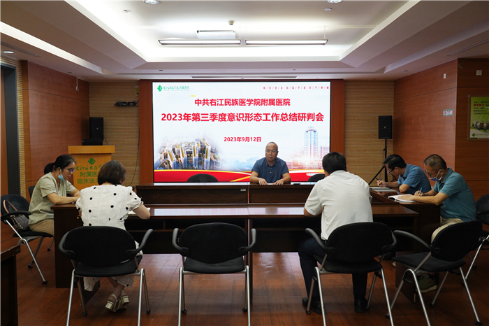 2023年9月12日下午,临床医学院(附属医院)在总院区门诊楼五楼会议室组织召开2023年第三季度意识形态工作总结研判会。临床医学院(附属医院)党委副书记、医院意识形态工作领导小组办公室主任陈文成主持会议并布置工作任务,宣传科、党办、组织科、教学部、毕教科、工会、团委、学生科、学科办与等相关部门负责人参加会议。