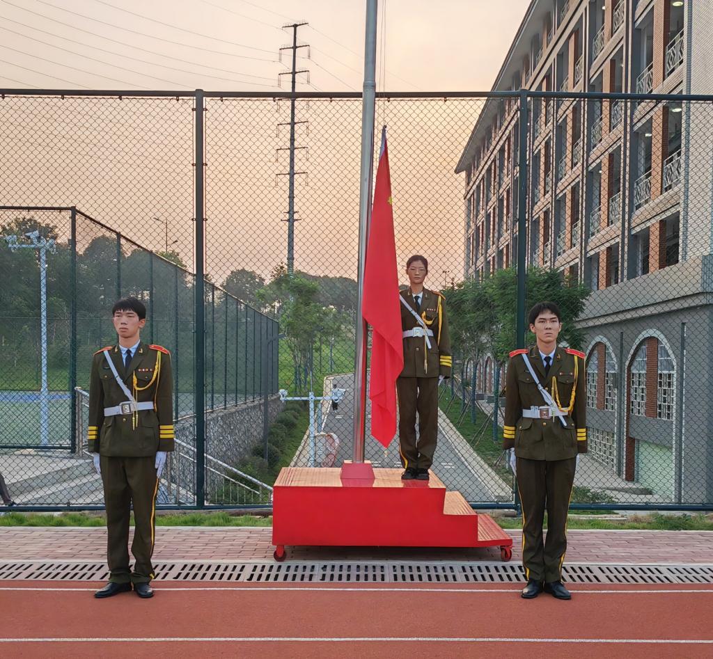 在全体师生的注目礼下,英姿飒爽的国旗护卫队队员们护送着鲜艳的五星红旗,伴随着庄严的中华人民共和国国歌,五星红旗冉冉升起,迎风飘扬。