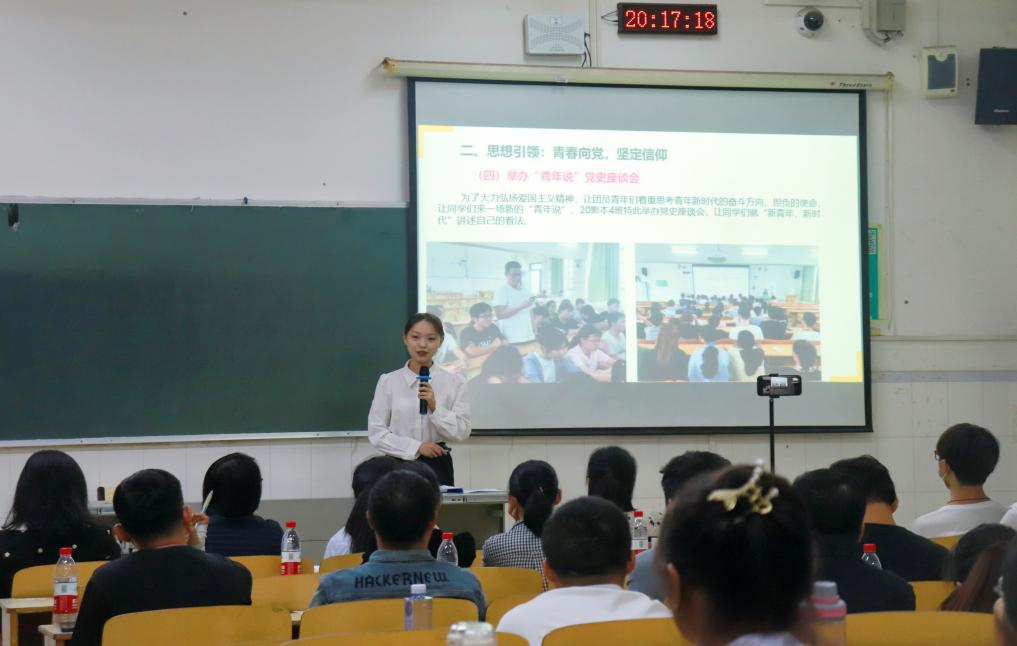 会上,卢小新老师介绍了本次评比的规则,百城校区及百东校区线上线下同时开展,九个班级按照抽签顺序依次进行述职,各辅导员、班主任、各组织代表及群众代表参与评分。各班级代表围绕班风建设、学风建设、思想政治、文化活动和特色活动五个各方面进行述职,全面展示了班级的精神风貌、班级建设情况。