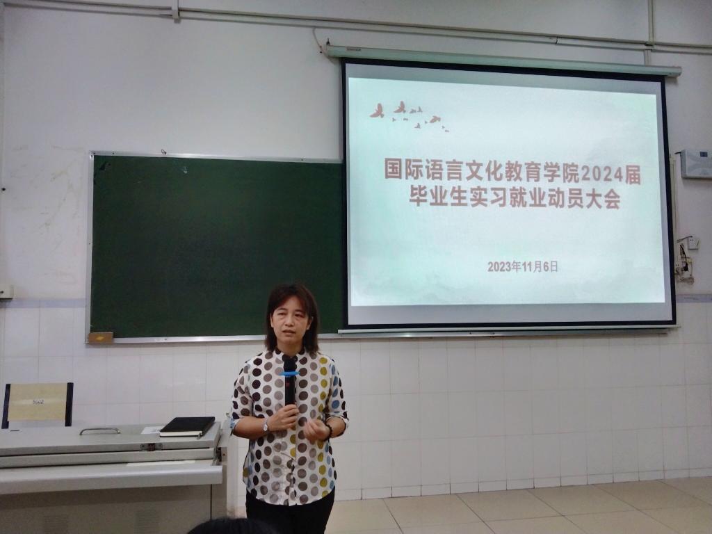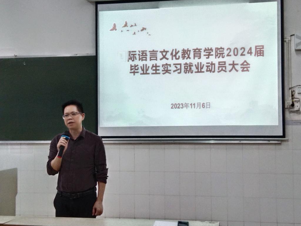为进一步做好毕业生实习就业教育管理工作,推动毕业生尽早落实毕业去向,2023年11月6日下午,国际语言文化教育学院在5栋506召开2024届毕业生实习、就业动员大会,国际语言文化教育学院党委书记、院长潘廷将,副书记张剑、教学科科长江利娟、学生科科长蒙丽莎老师以及毕业班班主任出席会议。2024届全体毕业生参加了本次动员大会,会议由张剑副书记主持。