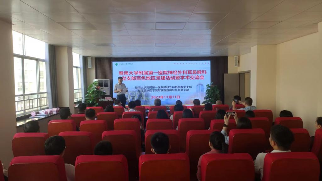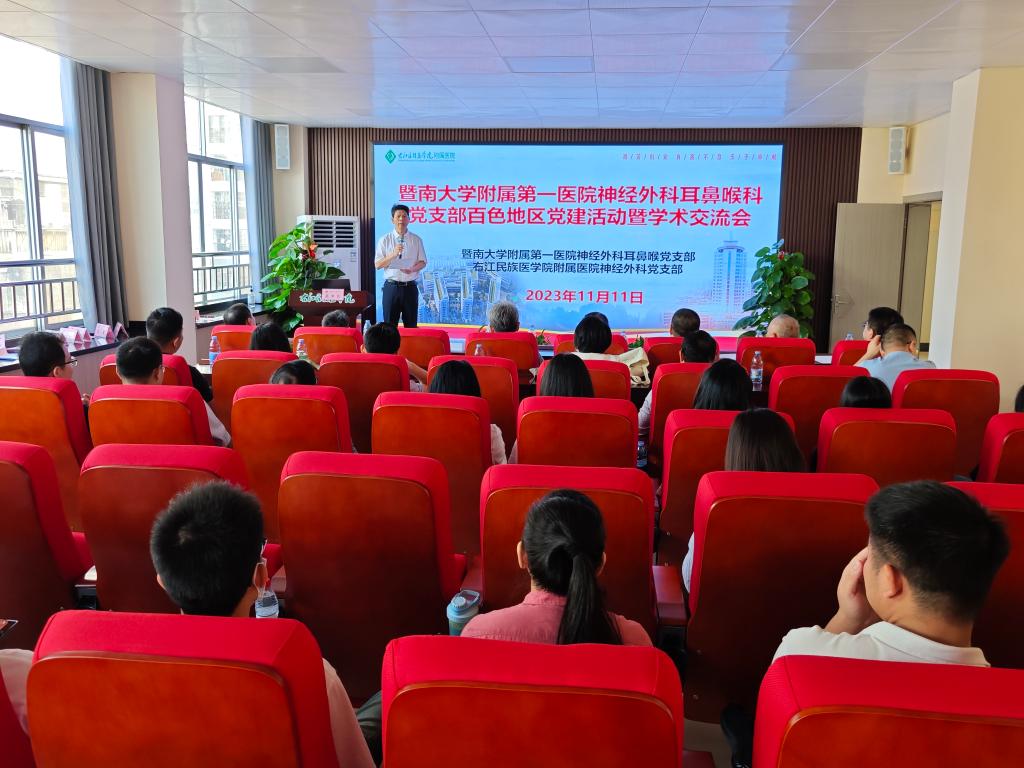 2023年11月11日,暨南大学附属第一医院脑科医院副院长、神经外科主任、中国神经外科专科医师规范化培训基地主任、国家卫生健康委能力建设和继续教育中心神经外科进修与培训基地主任王向宇教授带领该院神外耳鼻喉党支部党员专家一行19人,到我院国家卫健委神经外科建设中心开展检查指导及学术交流活动,并于当日上午在开云kaiyun登录入口临床实验技能中心7楼会议室召开党建学术交流会。我院副院长蓝常贡出席会议并致辞,我院神经外科党支部党员和科室全体医护人员参加会议。我院神经外科主任、国家级神经外科建设中心负责人黄海能教授主持会议。