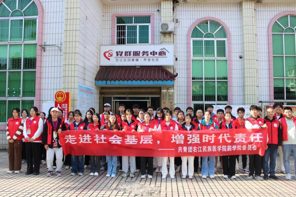 为深入开展面向广大团员和青年的主题教育,引导团员和青年认真学习贯彻习近平新时代中国特色社会主义思想,激发大学生的志愿服务热情与青春活力,增强大学生的社会责任感和使命感。11月18日,药学院党委组织各党支部、团支部学生志愿者到右江区四塘镇侨吉社区开展大学生进社区社会实践活动。