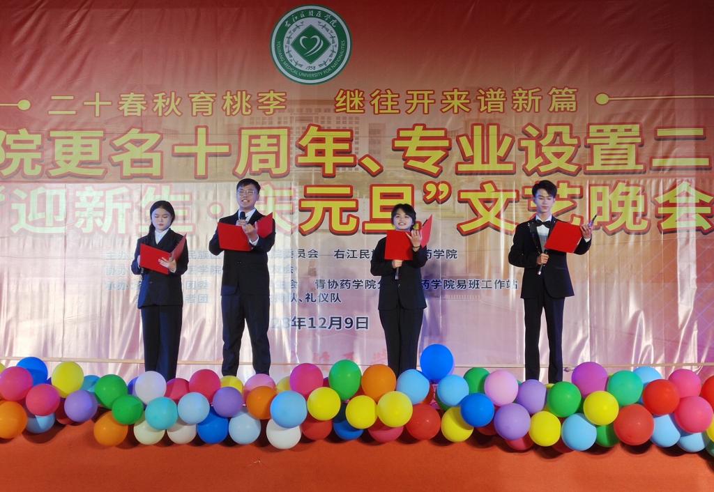 时光如水,忆往昔筚路蓝缕;岁月如歌,看今朝再谱新篇。为了展现药学院师生的先进风采,增强药学院师生的归属感、认同感及自豪感,纪念药学院更名十周年、专业设置二十周年这一个极具意义的日子,2023年12月9日晚,药学院在百东校区田径场举办庆祝药学院更名十周年、专业设置二十周年暨“迎新生·庆元旦”文艺晚会。