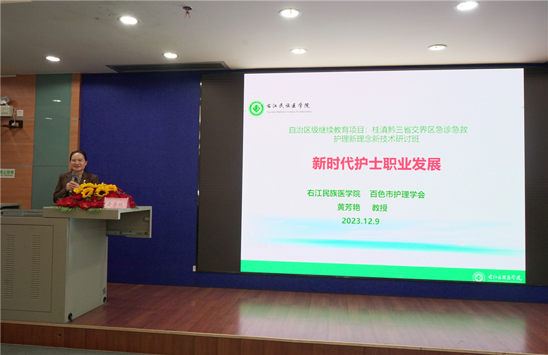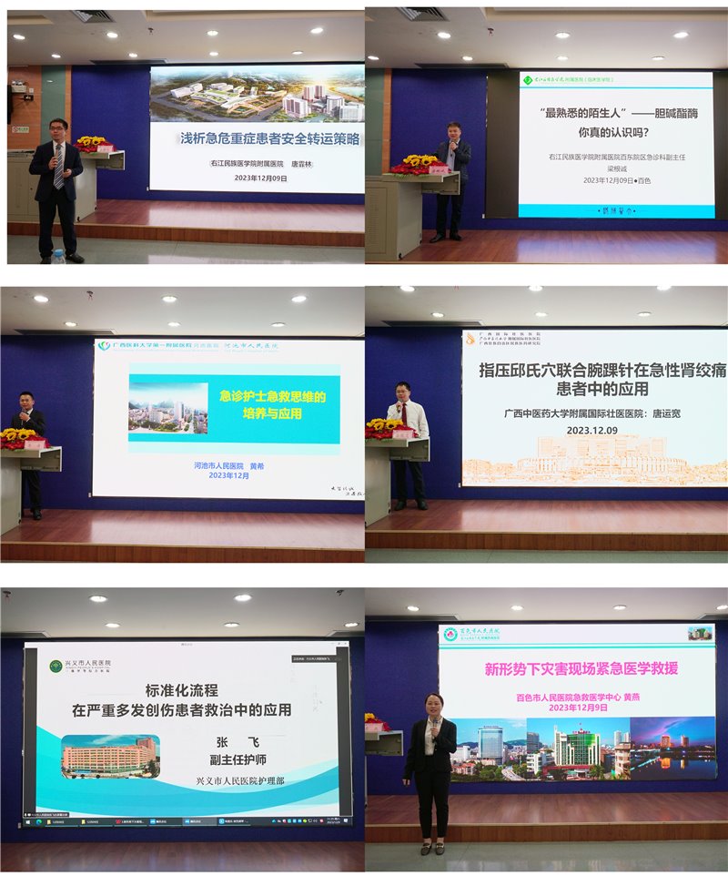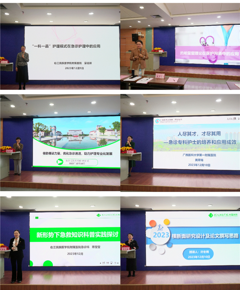 授课过程中,百色市护理学会理事长黄芳艳、开云kaiyun登录入口护理学院副院长麻新灵、右医附院护理部主任陆柳雪、广西医科大学第一附属医院急诊科急诊片区护士长黄翠青、贵州省兴义市人民医院片区护士长兼介入室护士长张飞、右医附院综合科护士长蒙连新、广西国际壮医医院急诊科护士长唐运宽、河池市人民医院门诊部护士长黄希、右医附院百东院区急诊科副主任梁根诚、右医附院急诊科副护士长唐霏林、百色市人民医院急救医学中心副士长黄燕、右医附院EICU副护士长许冬梅、右医附院急诊科护士长覃莹莹等分别作了《新时代职业护士发展》、《借鉴循证力量,优化急诊通道,助力护理专业化发展》、《哈约里窗理论在医护沟通中的应用》、《急诊专科护士的培养和应用成效》、《标准化流程在严重多发创伤患者救治中的应用》、《“一科一品”护理模式在急诊护理中的应用》、《指压邱氏穴联合腕踝针在急性肾绞痛患者中的应用》、《急诊护士急救思维的培养与应用》、《急性中毒诊疗新进展》、《危重症患者转运安全策略》、《新形势下灾害现场紧急医学救援》、《横断面研究设计及论文撰写思路》、《新形式下急救科普实践探讨》等专题授课。