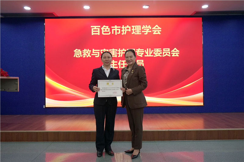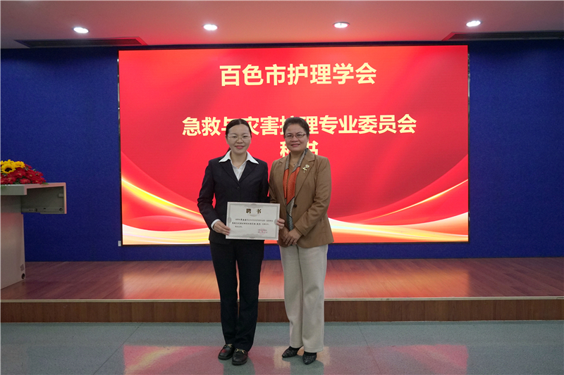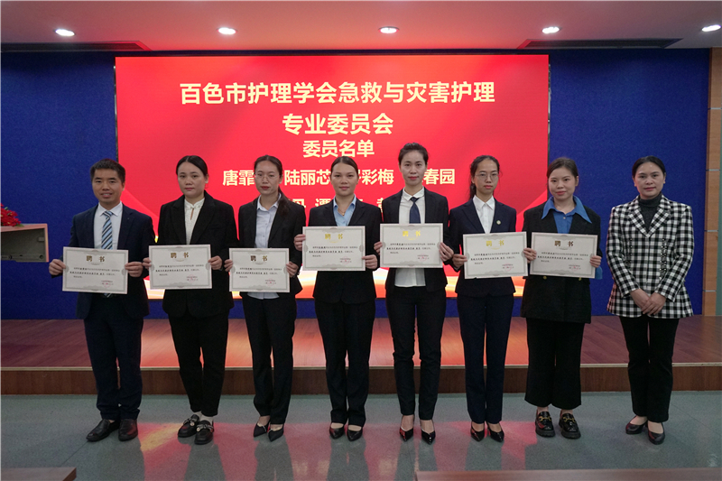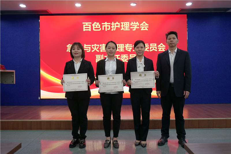 百色市护理学会副理事长、右医附院护理部主任陆柳雪宣读了百色市护理学会第一届急救与灾害护理专业委员会委员名单,右医附院蓝常贡副院长,百色市护理学会理事长黄芳艳,百色市护理学会副理事长、右医附院护理部主任陆柳雪,百色市护理学会监事长、右医附院监察办公室主任刘芳印及第一届专委会主任委员周兰岛分别为委员们颁发聘书,同时召开百色市护理学会第一届急诊急救与灾害护理专业委员会第一次会议。