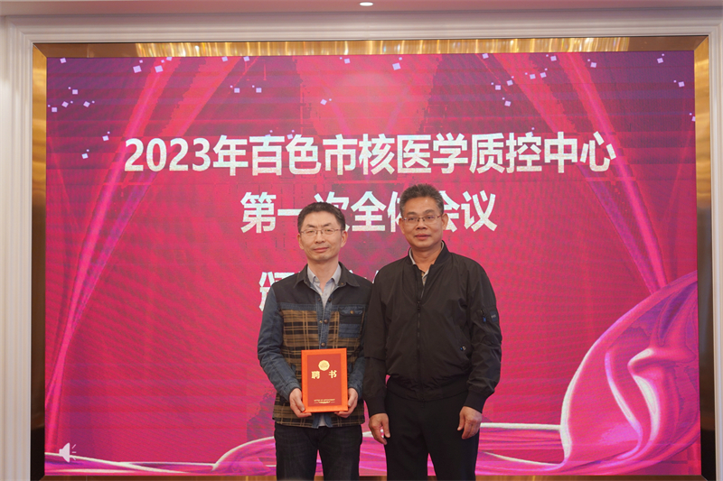 其后,百色市卫生健康委员会副主任、市中医药管理局局长张军将“百色市核医学诊疗质量控制中心”牌匾授予百色市核医学质量控制中心主任郑红宾博士;广西医科大学第一附属医院核医学科主任、广西核医学质量控制中心主任韦智晓教授为郑红宾博士和百色市核医学质量控制中心第一届委员会委员颁发聘任证书。