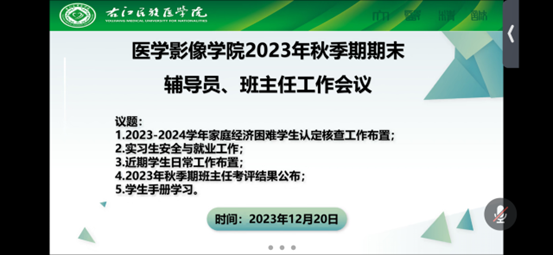 为进一步做好期末大学生各项工作,12月20日晚,医学影像学院召开2023年秋季学期期末辅导员、班主任工作线上会议。学院党委书记李丹,全体辅导员、班主任参加会议,会议由学生科卢小新主持。