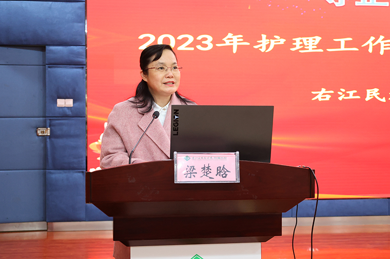 临床医学院(附属医院)韦忠恒院长最后在总结讲话中强调,全院护理人员在2023年不分昼夜、不辞劳苦,始终以饱满的状态,在平凡的岗位上继承和发扬南丁格尔“不畏艰险、甘于奉献、救死扶伤、勇于献身”的人道主义精神,践行着“根植老区为人民,医者患者一家人”理念,医院护理事业在护理质量、服务态度、专业技能等各方面都取得了长足进步,赢得了同行和社会的广泛赞誉。韦忠恒院长表示,医院目前正处于“一院两区”高质量发展的起步阶段,也是规模扩张与质量提升并存的关键时期,希望全院护理工作者首先要提高政治站位,树立忧患意识,结合2024年任务目标,围绕学校第八次党代会的会议精神,进一步加强护理专科的建设,打造桂西一流、省内有重要影响力的“医教研协同发展型”学科。其次要继续探索“一院两区”同质化管理模式,创建科室品牌、医院品牌,稳步推进“互联网+护理服务”工作,深入推进优质护理服务 ,提高患者满意度,提高医院的社会效益。最后要重视DRG付费改革工作,积极响应国家政策,高质量推进三级医院等级复审工作,加快迈出“六位一体”协同发展的“一院多区”医疗集团新征程的步伐,为实现医院“一院多区”跨越式发展以及学校早日建成区域性高水平医科大学而努力奋斗。