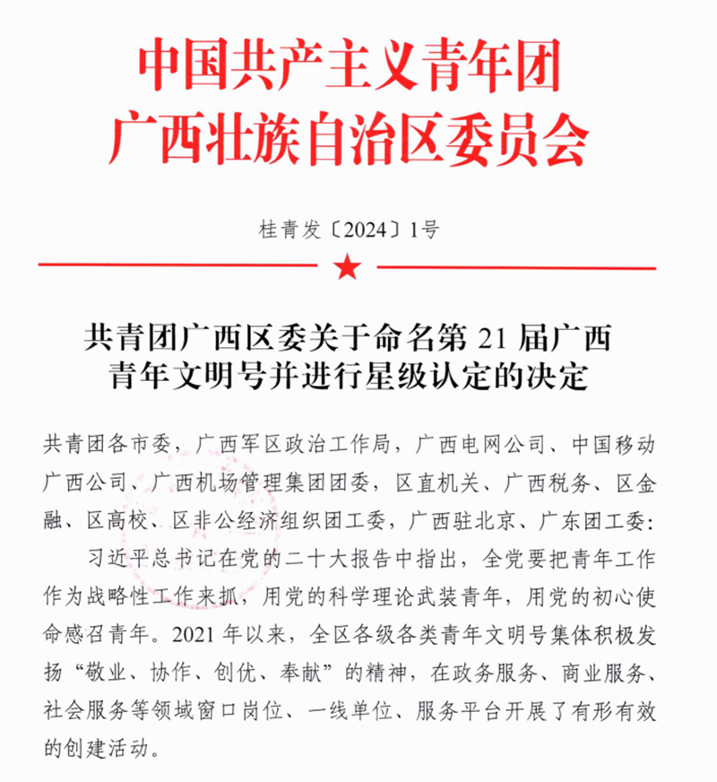 近日,中国共产主义青年团广西壮族自治区委员会发布《关于命名第21届广西青年文明号并进行星级认定的决定》,其中我院血液内科、医学检验科、神经内科二病区、放射科、门急诊药房等5个青年集体被评为“第21届广西青年文明号”并认定为“一星级广西青年文明号”,充分展现出新时代我院青年的精神文明风采。