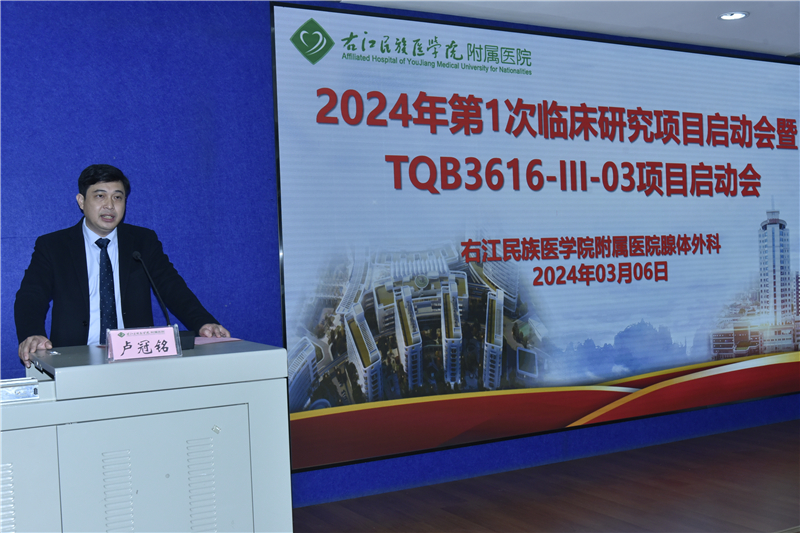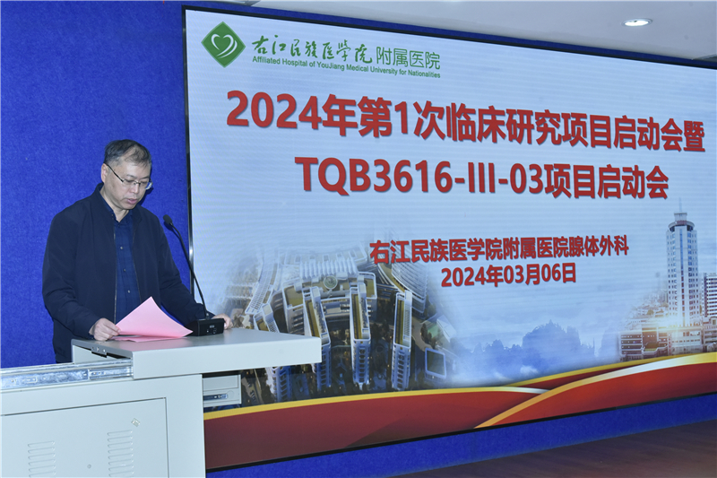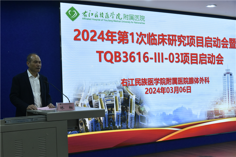 上午9时,林栩首先在启动会上致辞并宣布2024年第1次临床研究项目启动会暨TQB3616-III-03项目正式启动。他强调,TQB3616-III-03作为医院首个肿瘤药Ⅲ期药物临床试验项目,标志着右医附院药物临床试验研究工作正式启动。GCP项目是培养医务人员严谨、规范的医疗作风和科研思路的绝好机会,对进一步提高医疗质量和科研水平,扩大学术影响力有着积极作用。林栩希望项目所有参与者都要严格遵守GCP规范,遵守相关法律法规,保质保量完成项目研究。医院也将以此次研究为契机,结合医院GCP平台和临床诊疗特色,加大创新力度,秉持“根植老区为人民 医者患者一家人”的办院宗旨,有序、扎实地开展好工作,为百色患者的健康带来更多福音。